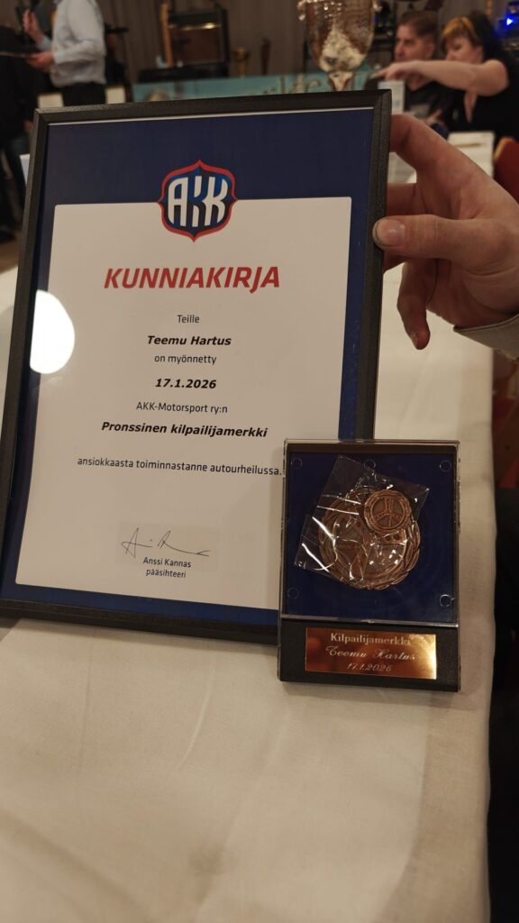 Akk myöntänyt teamin puheenjohtajalle Teemu Hartukselle pronssisen kilpailijamerkin ansioituneesta työstä autourheilun eduksi. Tämä on myös hieno ele AKKlta , joka huomioi myös Minitonni luokan ja sen työn, jota Teemu on tehnyt luokan pysymisenä vahvana ja hyvänä.